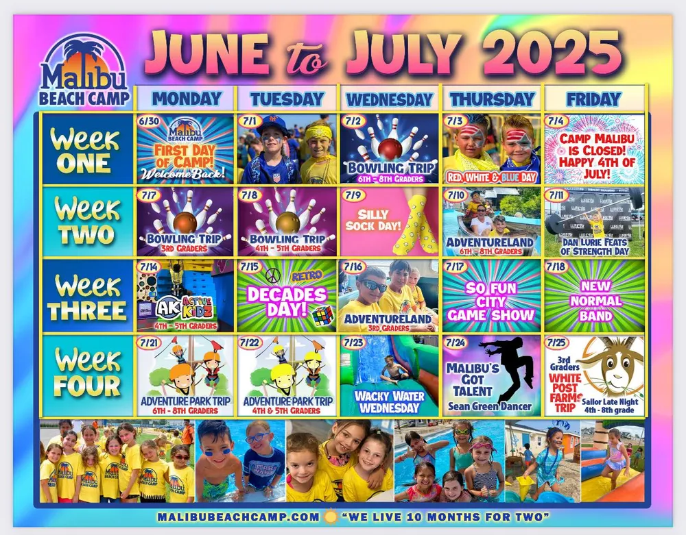 - Rest Mat: For Nursery, Pre-K, and Kindergarten campers, a foldable rest mat is needed for story and snack time.Malibu Beach Camp